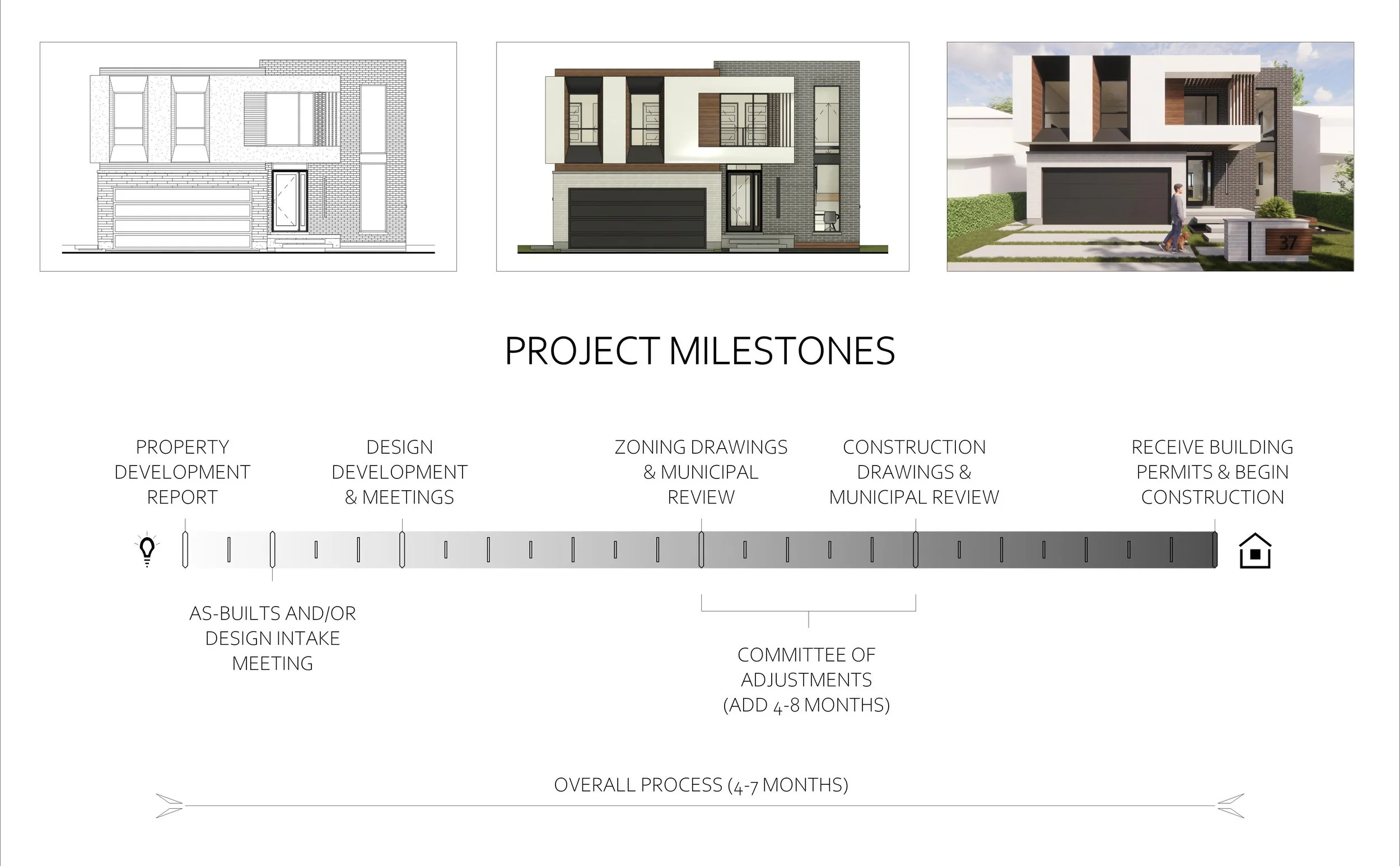 The first step for us is to analyze the zoning by-laws applicable to your property so that we can determine the feasibility of your desired scope of work. We’ll let you know if the house, addition, multiplex, laneway or garden suite that you’re looking for will fit on the property. We’ll also advise if any external authority bodies are needed for approvals such as committee of adjustment, forestry, or conservation authorities.