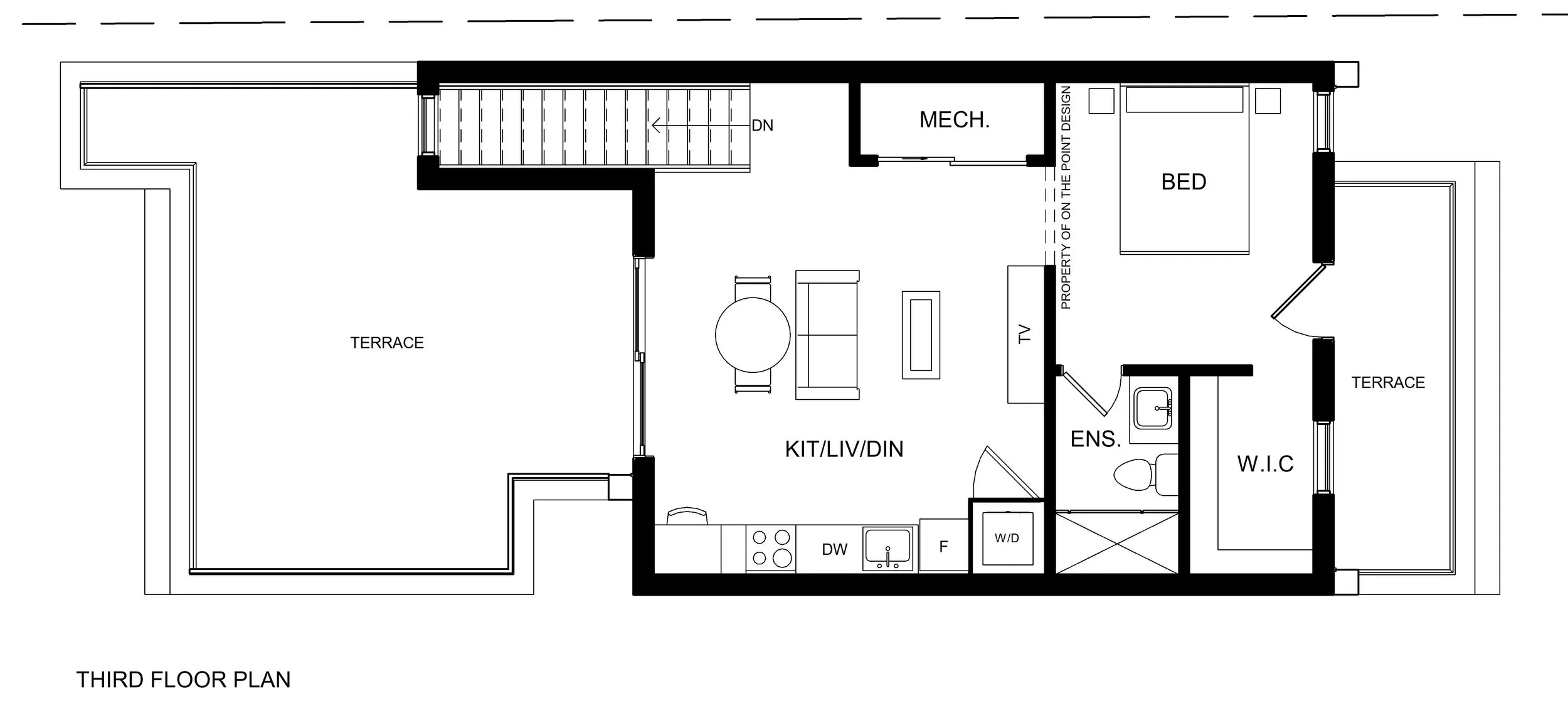 The existing house on the property was demolished to create a 3-storey fourplex with one unit per floor. The basement unit has 4 bedrooms and 2.5 bathrooms, the ground floor unit has 3 bedrooms and 2 bathrooms, the second floor unit has 2 bedrooms and 2 bathrooms, and the third floor unit has 1 bedroom and 1 bathroom. Each unit has dedicated entrances along with open concept kitchen/living/dining spaces. The basement has a walk-out patio space, the ground floor has a rear deck, the second floor has a rear terrace, and the third floor has front and rear terraces. On the exterior, the tiered massing creates the terraces within the building footprint with a side light well bringing daylight to the middle of the building. The horizontal black siding with wood slat accents creates a modern facade. Black aluminum canopies with light bands wrap around the front and rear facades. The rear lane access provides parking but the building was designed to leave space for an 848 sq.ft. per floor 2-storey laneway suite in the future.
